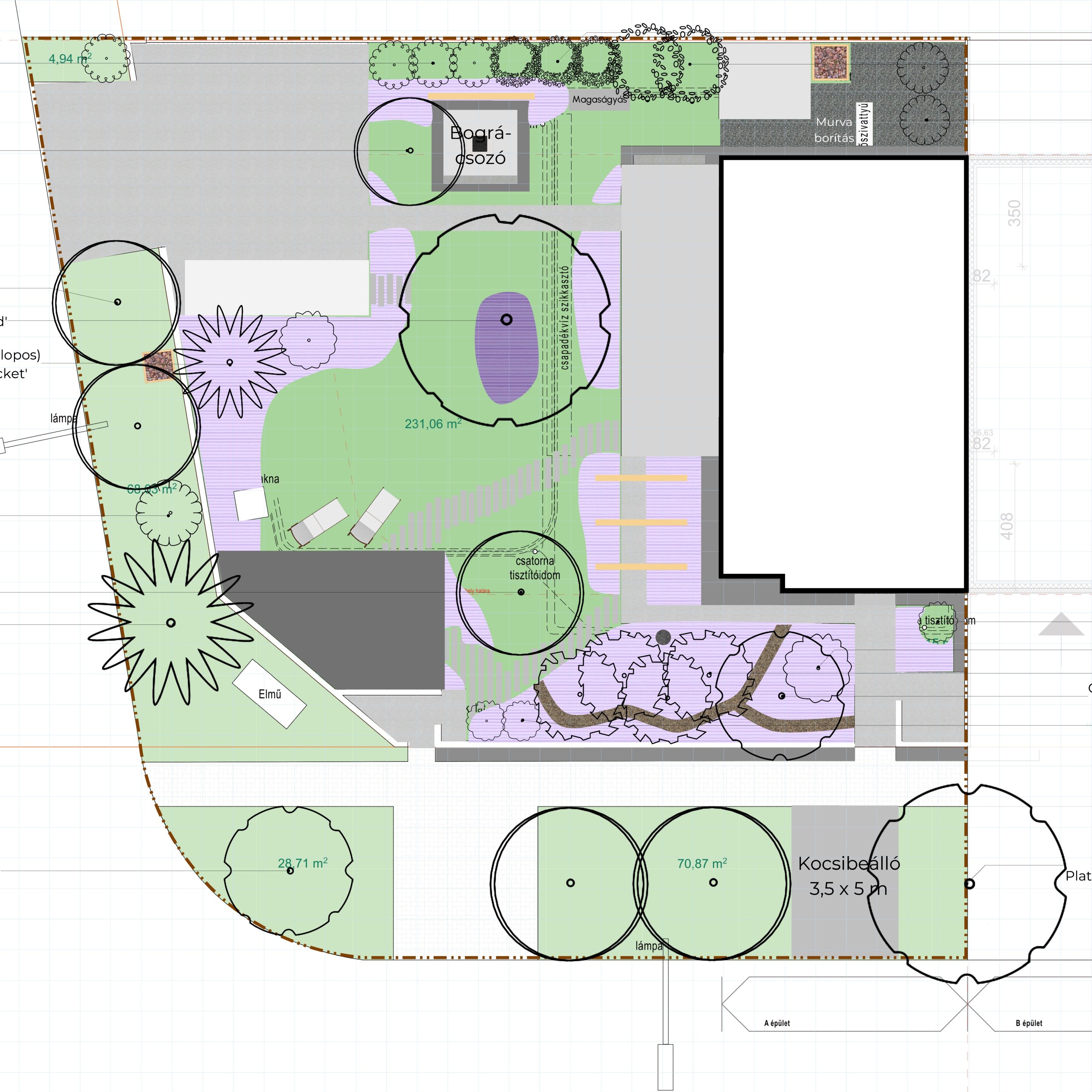A koncepcióterv tartalmazni fogja a kerted méretarányos alaprajzát, benne az egyes területek, funkciók elhelyezkedését, a fákat és a nagyobb cserjéket és az egyszerűsített látványtervet, melyet digitális formátumban a rendelkezésedre bocsátok.